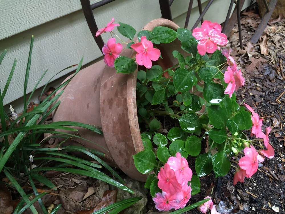 /A pot of impatiens at the corner of my Bluebird Gardens home getting some rain.